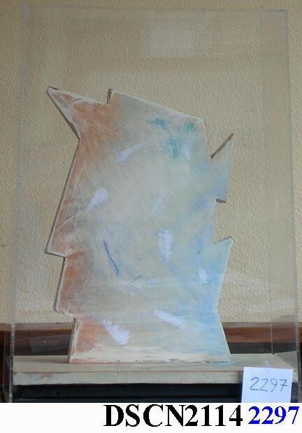 Painted Plaster and Wood. Earth tones, blue, white, green, black and rose. Object 18 1/4" x 16 3/4" x 8 1/4" on Gypsum wallboard, spackle and wood in a 24 3/4" x 17 1/2" x 9 1/8" acrylic display case. Signed near bottom edge, one side.Type of Sculpture