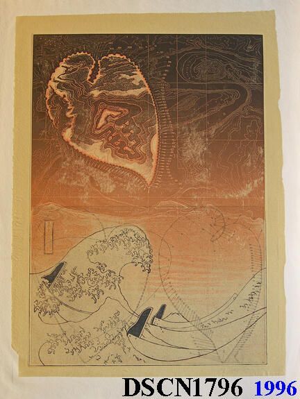 Artist's iconic images of heart-like forms called Loci (plural of Locus), the famous Hokusai print known as the "Great Wave" stylized, a map background derived from an area known as the "Crossing of the Fathers," on the Colorado River, now under Lake Powell, Arizona, filming site of the spaceship crash scene in Planet of the Apes. One of 141 impressions.Type of Print