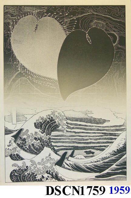 Artist's iconic images of heart-like forms called Loci (plural of Locus), the famous Hokusai print known as the "Great Wave" stylized, a map background derived from an area known as the "Crossing of the Fathers," on the Colorado River, now under Lake Powell, Arizona, filming site of the spaceship crash scene in Planet of the Apes. One of 141 impressions.Type of Print