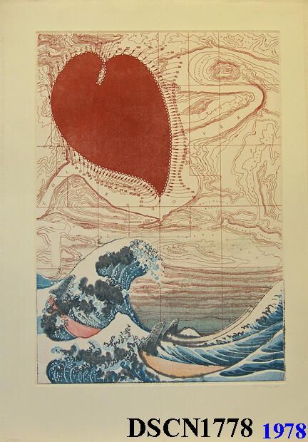 Artist's iconic images of heart-like forms called Loci (plural of Locus), the famous Hokusai print known as the "Great Wave" stylized, a map background derived from an area known as the "Crossing of the Fathers," on the Colorado River, now under Lake Powell, Arizona, filming site of the spaceship crash scene in Planet of the Apes. One of 141 impressions.Type of Print