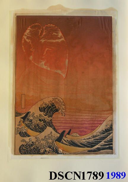 Artist's iconic images of heart-like forms called Loci (plural of Locus), the famous Hokusai print known as the "Great Wave" stylized, a map background derived from an area known as the "Crossing of the Fathers," on the Colorado River, now under Lake Powell, Arizona, filming site of the spaceship crash scene in Planet of the Apes. One of 141 impressions.Type of Print
