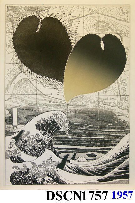 Artist's iconic images of heart-like forms called Loci (plural of Locus), the famous Hokusai print known as the "Great Wave" stylized, a map background derived from an area known as the "Crossing of the Fathers," on the Colorado River, now under Lake Powell, Arizona, filming site of the spaceship crash scene in Planet of the Apes. One of 141 impressions.Type of Print