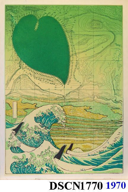 Artist's iconic images of heart-like forms called Loci (plural of Locus), the famous Hokusai print known as the "Great Wave" stylized, a map background derived from an area known as the "Crossing of the Fathers," on the Colorado River, now under Lake Powell, Arizona, filming site of the spaceship crash scene in Planet of the Apes. One of 141 impressions.Type of Print