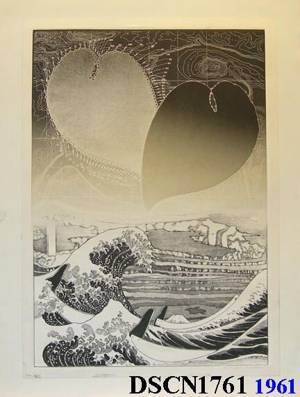 Artist's iconic images of heart-like forms called Loci (plural of Locus), the famous Hokusai print known as the "Great Wave" stylized, a map background derived from an area known as the "Crossing of the Fathers," on the Colorado River, now under Lake Powell, Arizona, filming site of the spaceship crash scene in Planet of the Apes. One of 141 impressions.Type of Print