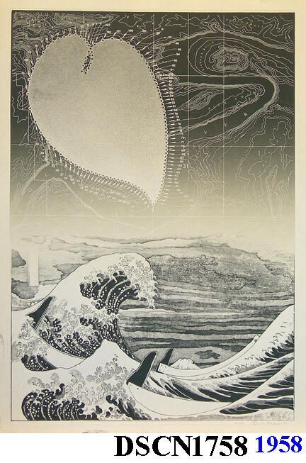 Artist's iconic images of heart-like forms called Loci (plural of Locus), the famous Hokusai print known as the "Great Wave" stylized, a map background derived from an area known as the "Crossing of the Fathers," on the Colorado River, now under Lake Powell, Arizona, filming site of the spaceship crash scene in Planet of the Apes. One of 141 impressions.Type of Print