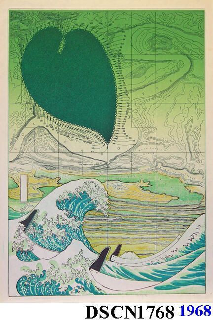 Artist's iconic images of heart-like forms called Loci (plural of Locus), the famous Hokusai print known as the "Great Wave" stylized, a map background derived from an area known as the "Crossing of the Fathers," on the Colorado River, now under Lake Powell, Arizona, filming site of the spaceship crash scene in Planet of the Apes. One of 141 impressions.Type of Print