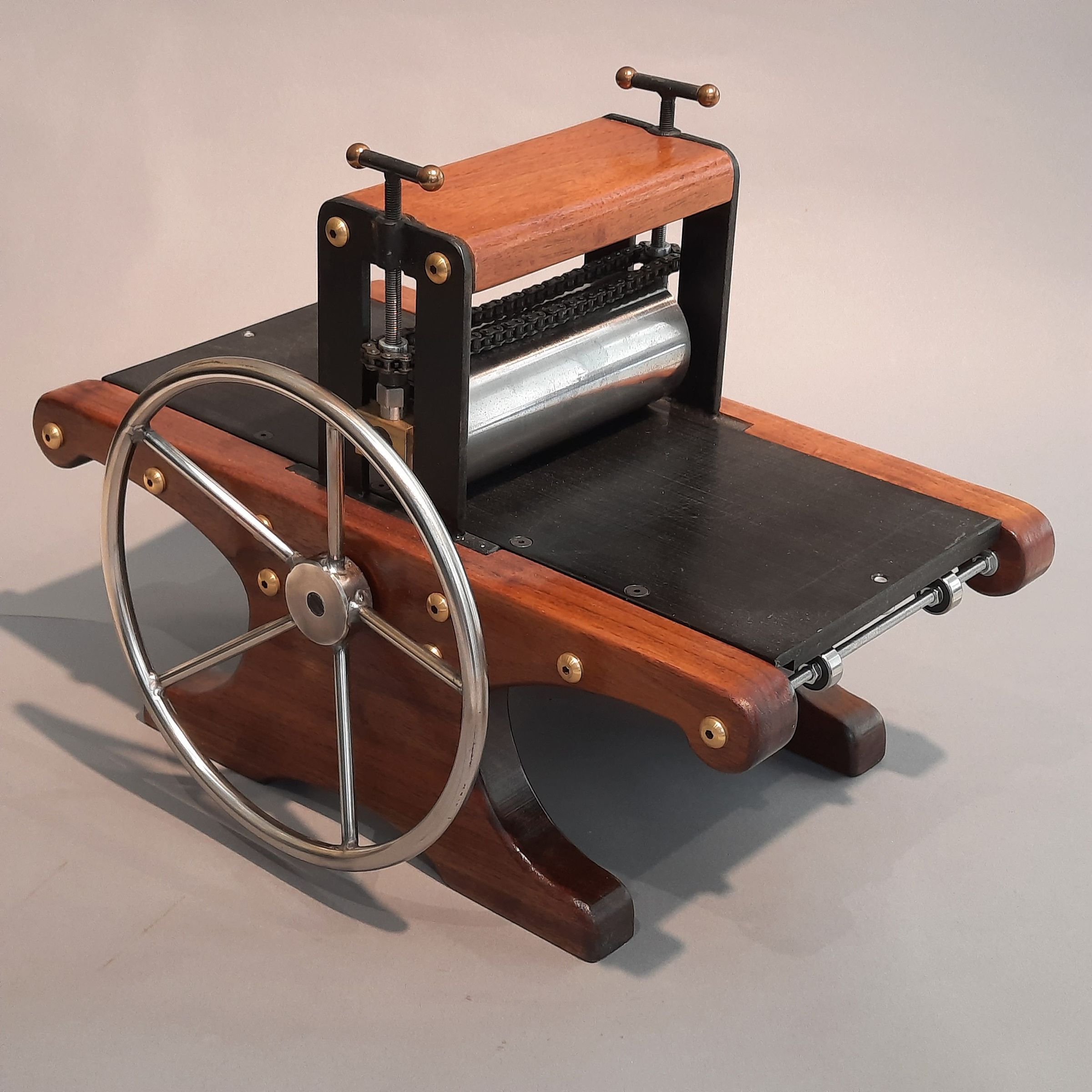 Most unique are the side plates are made of polished black walnut attached to the steel body with eight brass barrel cap nuts. The rack-driven bed is acetal, a plastic of hardness similar to polycarbonate measuring 3/8” thick, 6” wide and 14 1/2” long. The 8” stainless steel wheel drives the gear chain system and driving shaft with a spur gear meshes with the bed’s rack gear. The top and bottom rollers are 1 1/2” steel on roller bearings. Synchronized pressure screws raise the top roller and the synchronizing chain keeps the top roller level, assuring uniform printing pressure across the width of the plate. The press is designed to produce prints from relief plates from 1/8” to type-high blocks. Thick intaglio plates present challenges, therefore 22 to 35 gauge plates are recommended.