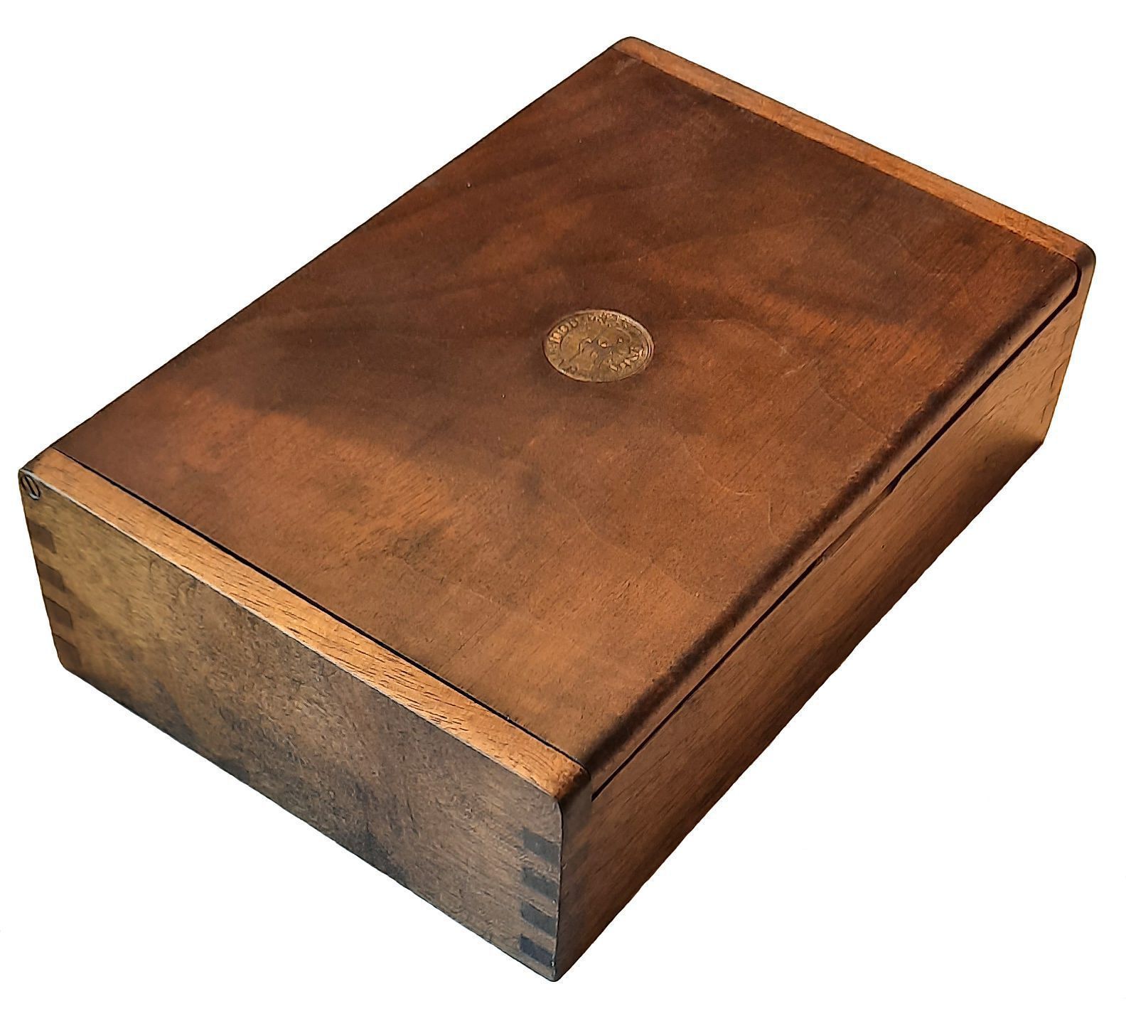 Wooden box with a lid that lifts up. It has a medallion in the center of the lid that says "Mini Halfwood Press, Model 5, 2004."Made/Created