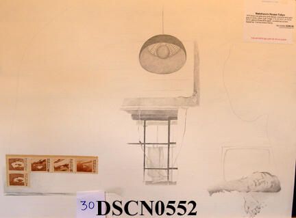 Silver and gold point and stamps. Cool blue, warm gray, brown and buff. Image 17" x 22 1/2" on 19" x 25" ges'soed Rives BFK paper, rounded top corners. Signed lower right.Artwork Details