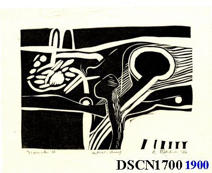 Relief. Black on white. Image 5 1/2" x 4" on 6 3/4" x 8 1/2" Japanese paper. Signed lower right.Made/Created