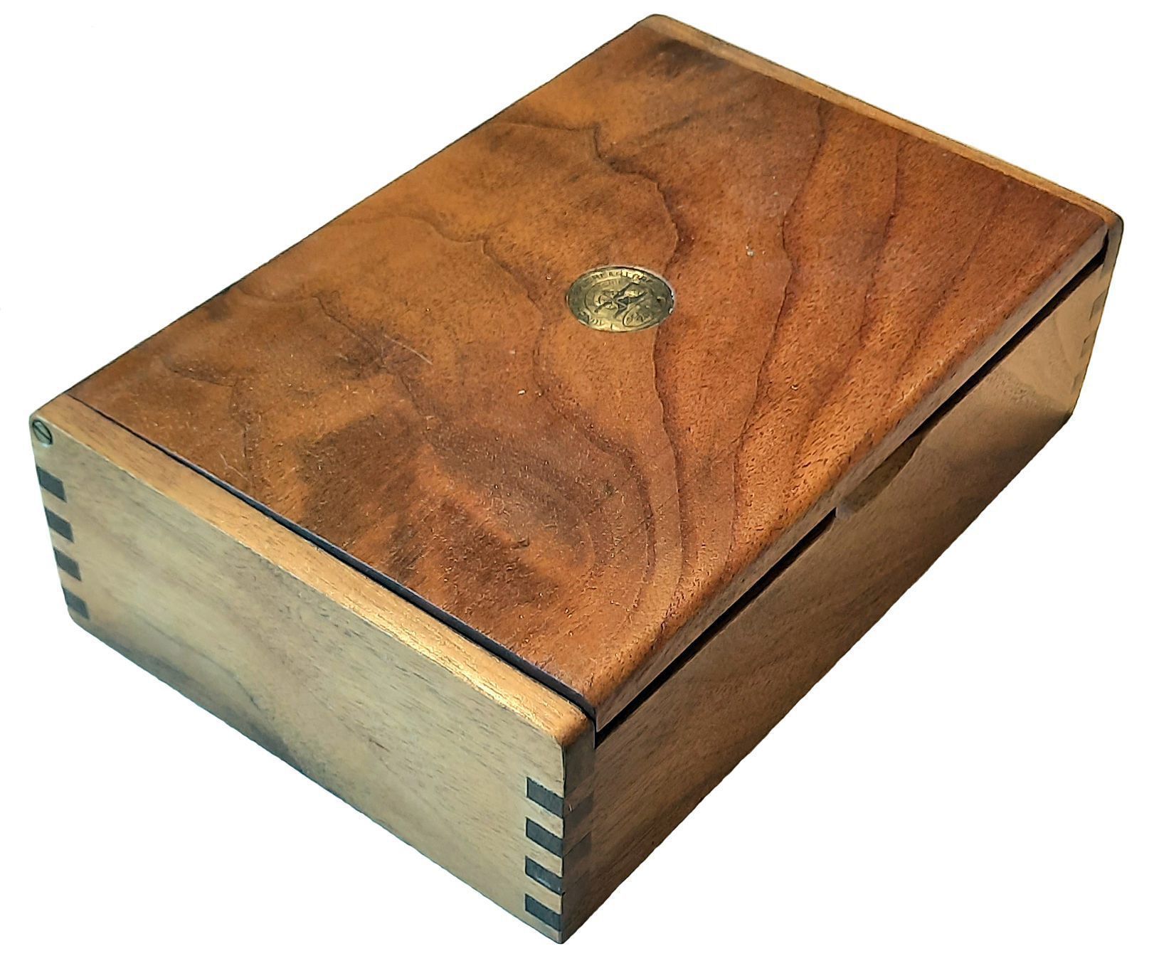 Wooden box with a lid that lifts up. It has a medallion in the center of the lid that says "Launch Purple Heart Press, B. Ritchie, Seattle, 2013."Made/Created