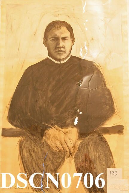 Conte, graphite and charcoal. Black and white. Image 37 1/2" x 23 3/4" on 39 1/4" x 25 3/4" ges'soed sulphite paper. Signed ll. Never exhibited publicly until used on Artist's In Retro Postcard Series, #Artwork Details