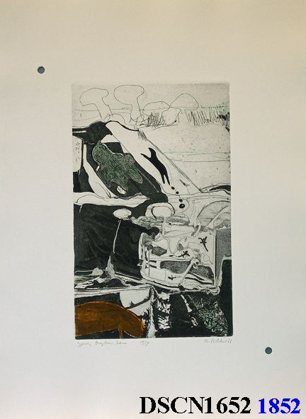 Intaglio. Black, ochre and green. Image 9" x 5 5/8" on 17 3/4" x 11 1/8" Rives BFK paper. Signed lower right.Made/Created