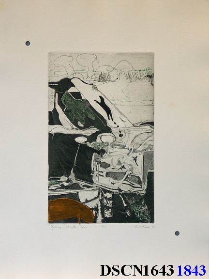 Intaglio. Black, ochre and green. Image 9" x 5 5/8" on 17 3/4" x 11 1/8" Rives BFK paper. Signed lower right.Made/Created