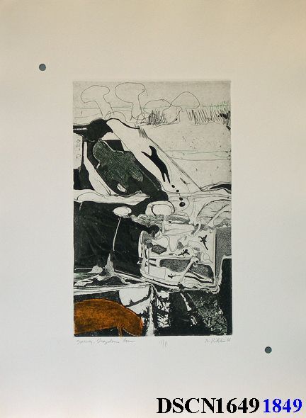 Intaglio. Black, ochre and green. Image 9" x 5 5/8" on 17 3/4" x 11 1/8" Rives BFK paper. Signed lower right.Made/Created