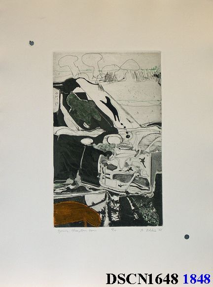 Intaglio. Black, ochre and green. Image 9" x 5 5/8" on 17 3/4" x 11 1/8" Rives BFK paper. Signed lower right.Made/Created