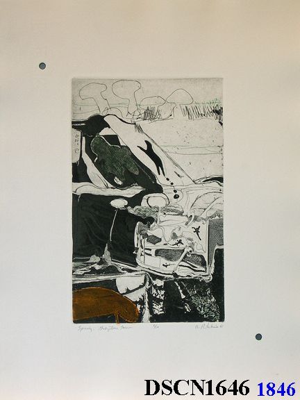 Intaglio. Black, ochre and green. Image 9" x 5 5/8" on 17 3/4" x 11 1/8" Rives BFK paper. Signed lower right.Made/Created