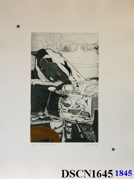 Intaglio. Black, ochre and green. Image 9" x 5 5/8" on 17 3/4" x 11 1/8" Rives BFK paper. Signed lower right.Made/Created