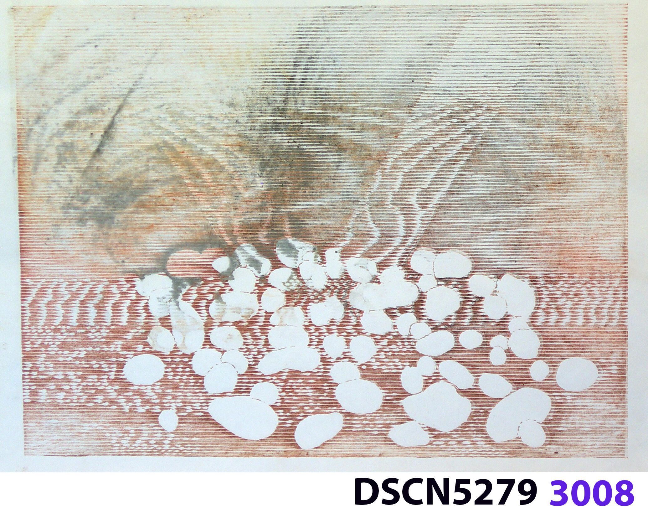 Stone Set: As a historical note, artist Bill Ritchie worked briefly at the Munch Museum studying the wood blocks that Edvard Munch cut and printed. Some of his woodcuts, notably "Badende Mann," (Bathing Man) he printed not as replicas or multiples all alike, but with different colors. These are termed monoprints, which means there are blocks which and be used to make almost identical impressions, but for artistic purposes (i.e., enjoyment of the creative artist) but the artist chose instead to make variations. In this print, Stone Set, Bill used an etched zinc plate from the Stone Set series and an under-image to a carved woodblock. Most, if not all, of the etched plates were printed in black, but the woodblock, being that it is printed with water-based colors in the Japanese manner (sosaku hanga) invites spontaneous color changes. The printer only has to dip the brush into a different color on the palette to produce a change. In other, mostly oil-based printing mediums, color changes are not that easy. Munch, for example, had to clean his inking slab and roller each time he wanted to try a different color. It must be mentioned, also, that Bill carved the lines in wood based on his video art. Television in those days was analog technology, with one or three electron beams scanning side-to-side of the picture from top to bottom and back again. The "picture" in Bill's video for this woodcut was not of the the real world, but the lines were instead the result of his stopping a videotape on a reel-to-reel videotape player and freezing the scanning at that stop-point. He photographed the TV screen, printed the negatiive, an traced it line-by line onto the woodcut and started carving. Another element to be mentioned is that the woodcut was printed on thin Asian paper (which works best in Japanese woodcut-style printing), let dry, then laminated to the etching in a second printing. The method is called Chine-colle, with water-based paste used to glue the sheets togehter. On close examination, one can tell the black oil-based etching ink is printed over the color, water-based ink.