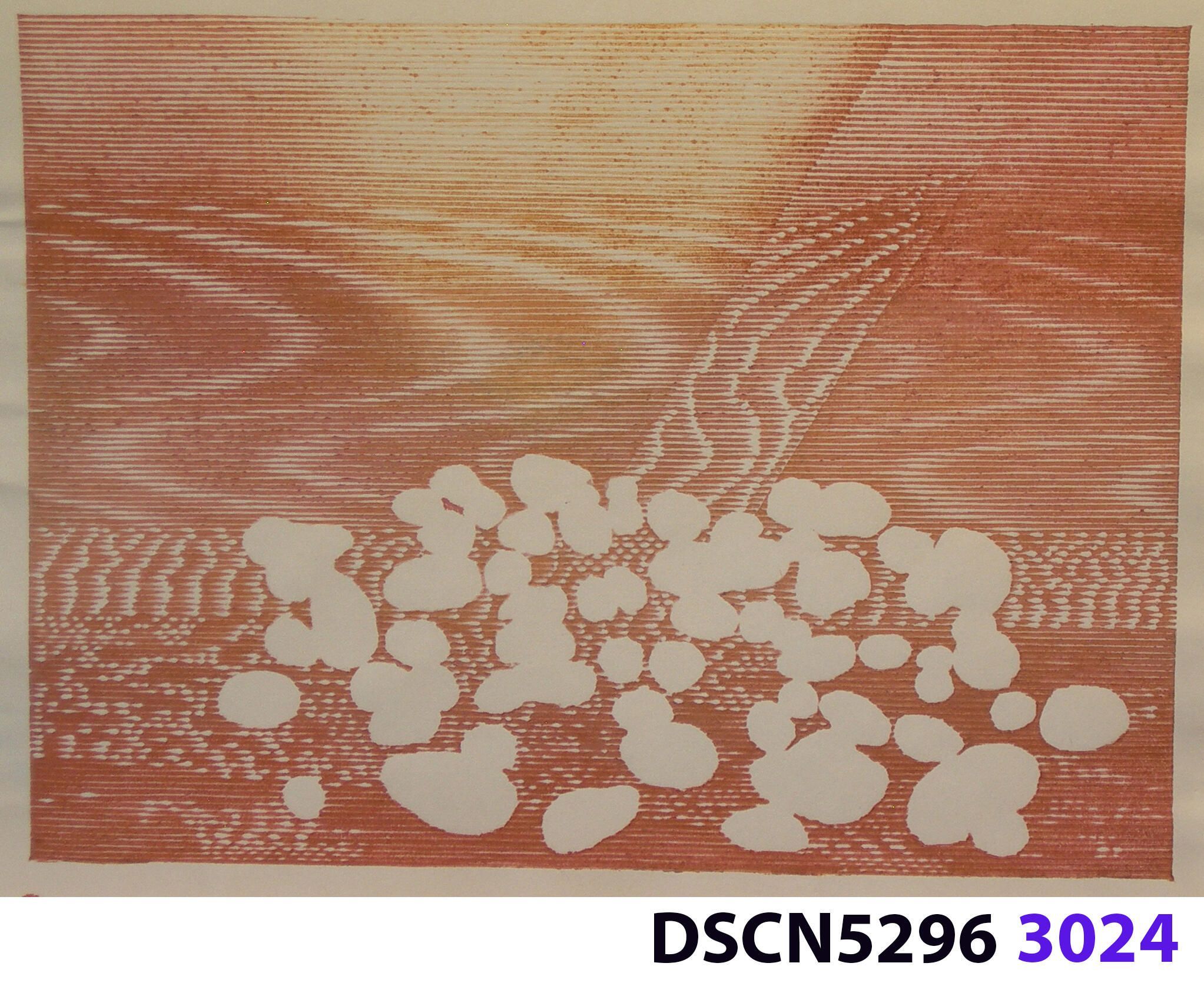 Stone Set: As a historical note, artist Bill Ritchie worked briefly at the Munch Museum studying the wood blocks that Edvard Munch cut and printed. Some of his woodcuts, notably "Badende Mann," (Bathing Man) he printed not as replicas or multiples all alike, but with different colors. These are termed monoprints, which means there are blocks which and be used to make almost identical impressions, but for artistic purposes (i.e., enjoyment of the creative artist) but the artist chose instead to make variations. In this print, Stone Set, Bill used an etched zinc plate from the Stone Set series and an under-image to a carved woodblock. Most, if not all, of the etched plates were printed in black, but the woodblock, being that it is printed with water-based colors in the Japanese manner (sosaku hanga) invites spontaneous color changes. The printer only has to dip the brush into a different color on the palette to produce a change. In other, mostly oil-based printing mediums, color changes are not that easy. Munch, for example, had to clean his inking slab and roller each time he wanted to try a different color. It must be mentioned, also, that Bill carved the lines in wood based on his video art. Television in those days was analog technology, with one or three electron beams scanning side-to-side of the picture from top to bottom and back again. The "picture" in Bill's video for this woodcut was not of the the real world, but the lines were instead the result of his stopping a videotape on a reel-to-reel videotape player and freezing the scanning at that stop-point. He photographed the TV screen, printed the negatiive, an traced it line-by line onto the woodcut and started carving. Another element to be mentioned is that the woodcut was printed on thin Asian paper (which works best in Japanese woodcut-style printing), let dry, then laminated to the etching in a second printing. The method is called Chine-colle, with water-based paste used to glue the sheets togehter. On close examination, one can tell the black oil-based etching ink is printed over the color, water-based ink.