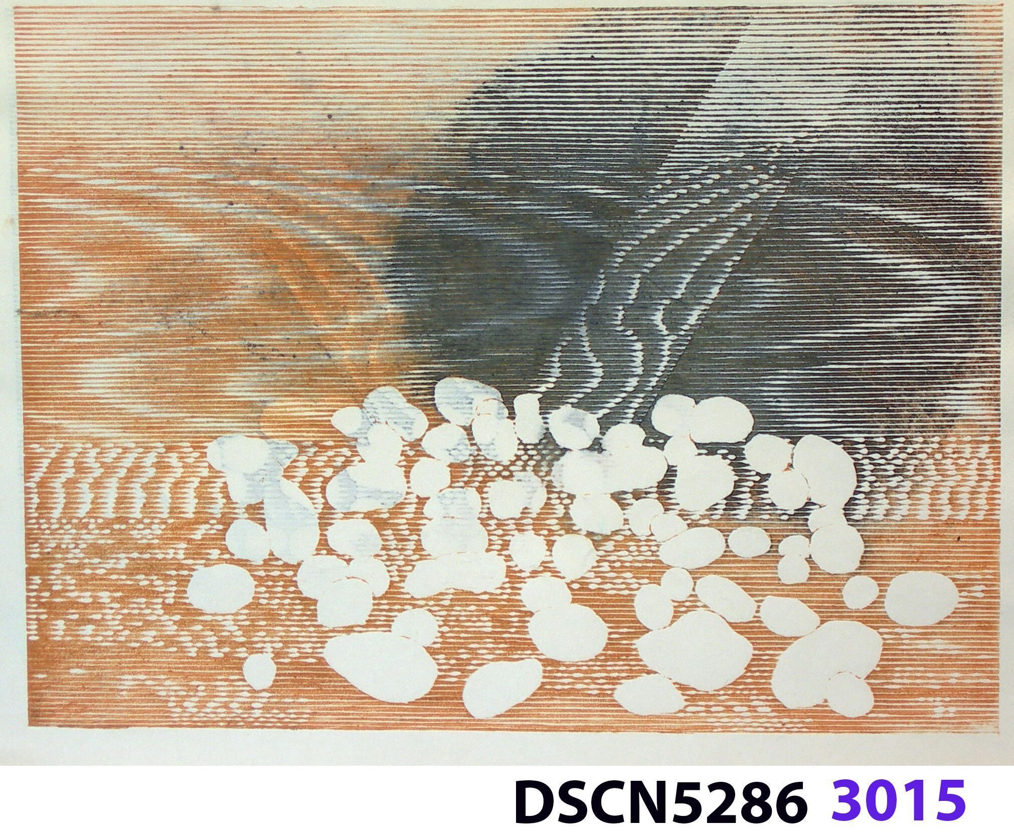 Stone Set: As a historical note, artist Bill Ritchie worked briefly at the Munch Museum studying the wood blocks that Edvard Munch cut and printed. Some of his woodcuts, notably "Badende Mann," (Bathing Man) he printed not as replicas or multiples all alike, but with different colors. These are termed monoprints, which means there are blocks which and be used to make almost identical impressions, but for artistic purposes (i.e., enjoyment of the creative artist) but the artist chose instead to make variations. In this print, Stone Set, Bill used an etched zinc plate from the Stone Set series and an under-image to a carved woodblock. Most, if not all, of the etched plates were printed in black, but the woodblock, being that it is printed with water-based colors in the Japanese manner (sosaku hanga) invites spontaneous color changes. The printer only has to dip the brush into a different color on the palette to produce a change. In other, mostly oil-based printing mediums, color changes are not that easy. Munch, for example, had to clean his inking slab and roller each time he wanted to try a different color. It must be mentioned, also, that Bill carved the lines in wood based on his video art. Television in those days was analog technology, with one or three electron beams scanning side-to-side of the picture from top to bottom and back again. The "picture" in Bill's video for this woodcut was not of the the real world, but the lines were instead the result of his stopping a videotape on a reel-to-reel videotape player and freezing the scanning at that stop-point. He photographed the TV screen, printed the negatiive, an traced it line-by line onto the woodcut and started carving. Another element to be mentioned is that the woodcut was printed on thin Asian paper (which works best in Japanese woodcut-style printing), let dry, then laminated to the etching in a second printing. The method is called Chine-colle, with water-based paste used to glue the sheets togehter. On close examination, one can tell the black oil-based etching ink is printed over the color, water-based ink.