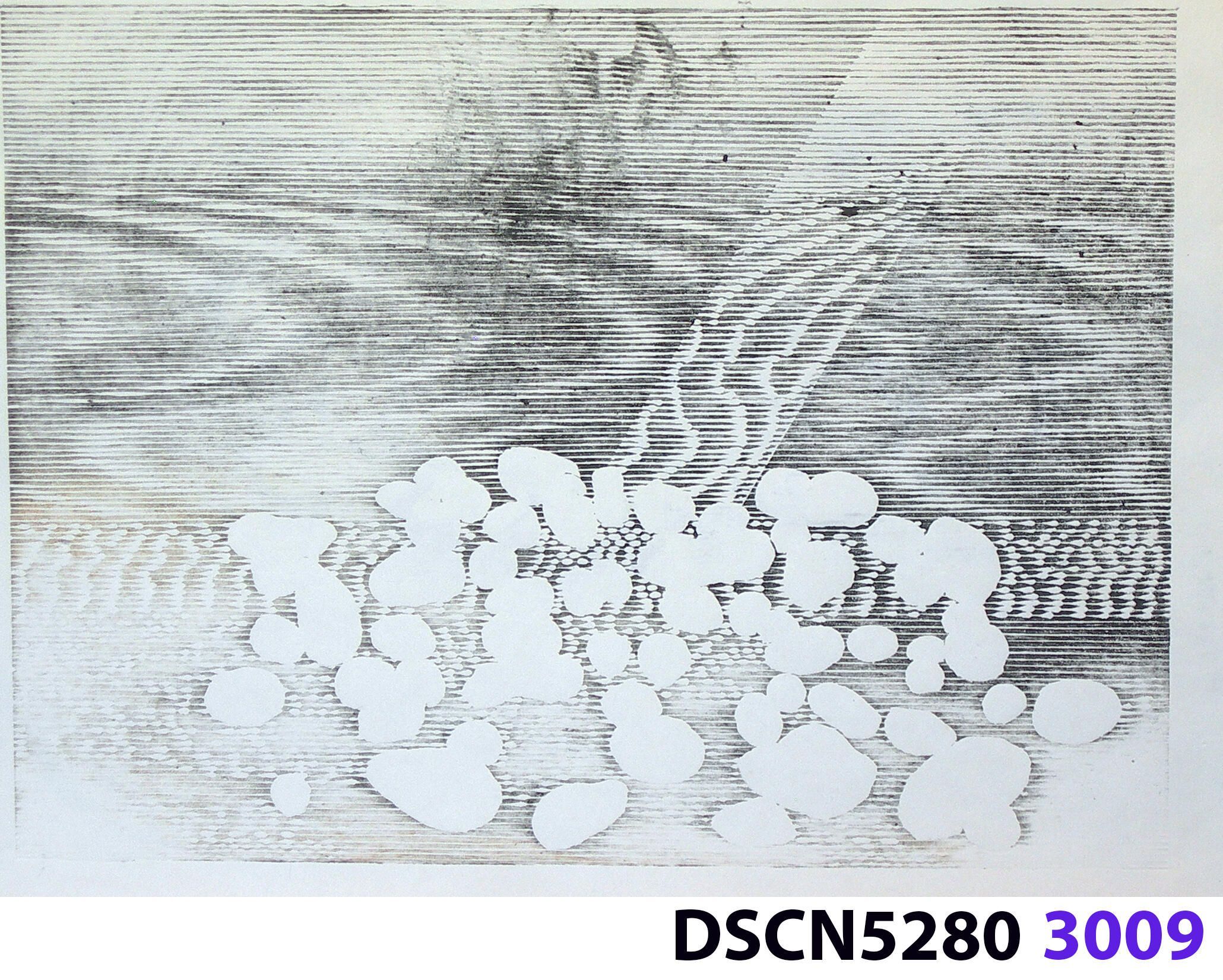 Stone Set: As a historical note, artist Bill Ritchie worked briefly at the Munch Museum studying the wood blocks that Edvard Munch cut and printed. Some of his woodcuts, notably "Badende Mann," (Bathing Man) he printed not as replicas or multiples all alike, but with different colors. These are termed monoprints, which means there are blocks which and be used to make almost identical impressions, but for artistic purposes (i.e., enjoyment of the creative artist) but the artist chose instead to make variations. In this print, Stone Set, Bill used an etched zinc plate from the Stone Set series and an under-image to a carved woodblock. Most, if not all, of the etched plates were printed in black, but the woodblock, being that it is printed with water-based colors in the Japanese manner (sosaku hanga) invites spontaneous color changes. The printer only has to dip the brush into a different color on the palette to produce a change. In other, mostly oil-based printing mediums, color changes are not that easy. Munch, for example, had to clean his inking slab and roller each time he wanted to try a different color. It must be mentioned, also, that Bill carved the lines in wood based on his video art. Television in those days was analog technology, with one or three electron beams scanning side-to-side of the picture from top to bottom and back again. The "picture" in Bill's video for this woodcut was not of the the real world, but the lines were instead the result of his stopping a videotape on a reel-to-reel videotape player and freezing the scanning at that stop-point. He photographed the TV screen, printed the negatiive, an traced it line-by line onto the woodcut and started carving. Another element to be mentioned is that the woodcut was printed on thin Asian paper (which works best in Japanese woodcut-style printing), let dry, then laminated to the etching in a second printing. The method is called Chine-colle, with water-based paste used to glue the sheets togehter. On close examination, one can tell the black oil-based etching ink is printed over the color, water-based ink.