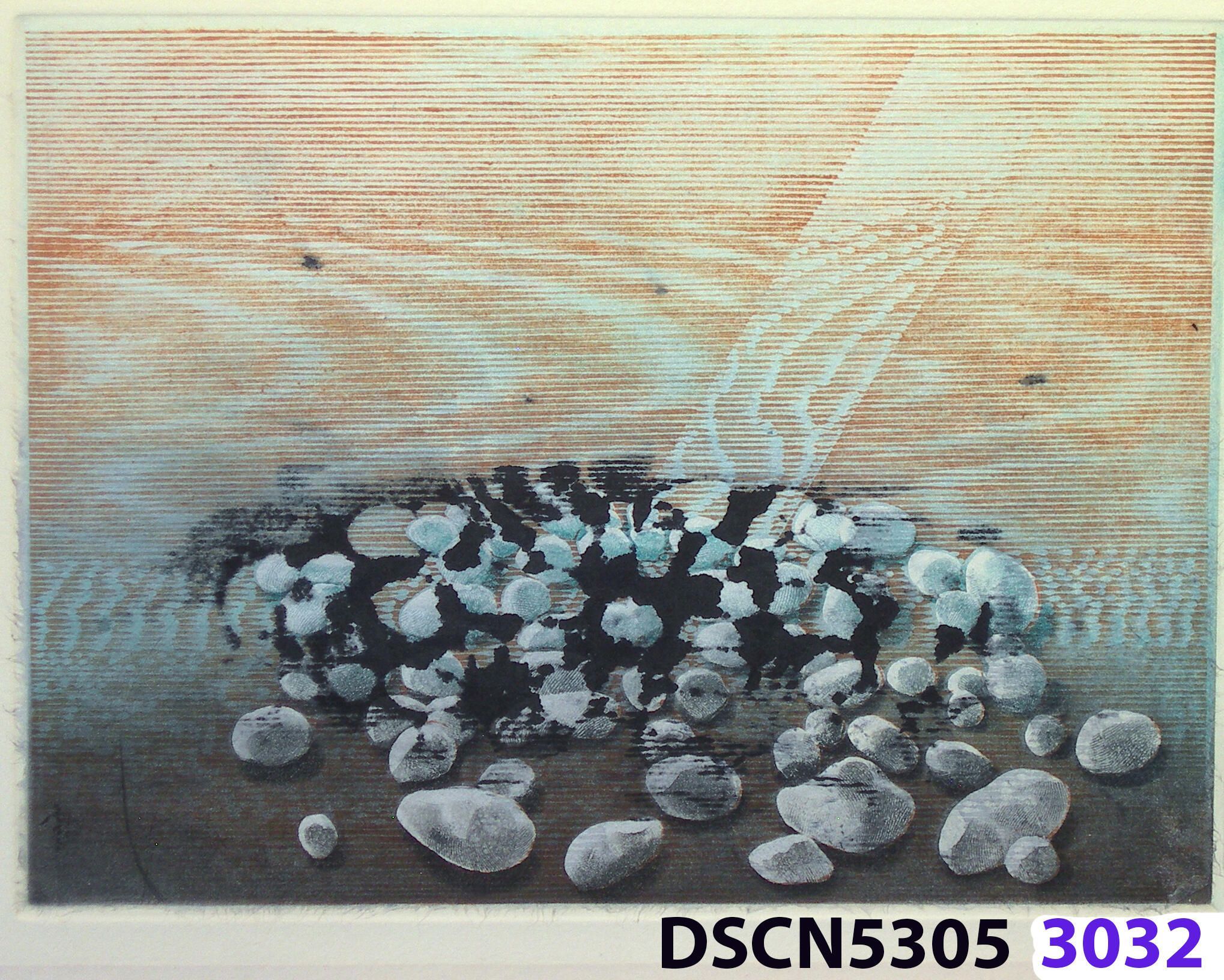 As a historical note, artist Bill Ritchie worked briefly at the Munch Museum studying the wood blocks that Edvard Munch cut and printed. Some of his woodcuts, notably "Badende Mann," (Bathing Man) he printed not as replicas or multiples all alike, but with different colors. These are termed monoprints, which means there are blocks which and be used to make almost identical impressions, but for artistic purposes (i.e., enjoyment of the creative artist) but the artist chose instead to make variations. In this print, Stone Set, Bill used an etched zinc plate from the Stone Set series and an under-image to a carved woodblock. Most, if not all, of the etched plates were printed in black, but the woodblock, being that it is printed with water-based colors in the Japanese manner (sosaku hanga) invites spontaneous color changes. The printer only has to dip the brush into a different color on the palette to produce a change. In other, mostly oil-based printing mediums, color changes are not that easy. Munch, for example, had to clean his inking slab and roller each time he wanted to try a different color. It must be mentioned, also, that Bill carved the lines in wood based on his video art. Television in those days was analog technology, with one or three electron beams scanning side-to-side of the picture from top to bottom and back again. The "picture" in Bill's video for this woodcut was not of the the real world, but the lines were instead the result of his stopping a videotape on a reel-to-reel videotape player and freezing the scanning at that stop-point. He photographed the TV screen, printed the negatiive, an traced it line-by line onto the woodcut and started carving. Another element to be mentioned is that the woodcut was printed on thin Asian paper (which works best in Japanese woodcut-style printing), let dry, then laminated to the etching in a second printing. The method is called Chine-colle, with water-based paste used to glue the sheets togehter. On close examination, one can tell the black oil-based etching ink is printed over the color, water-based ink.