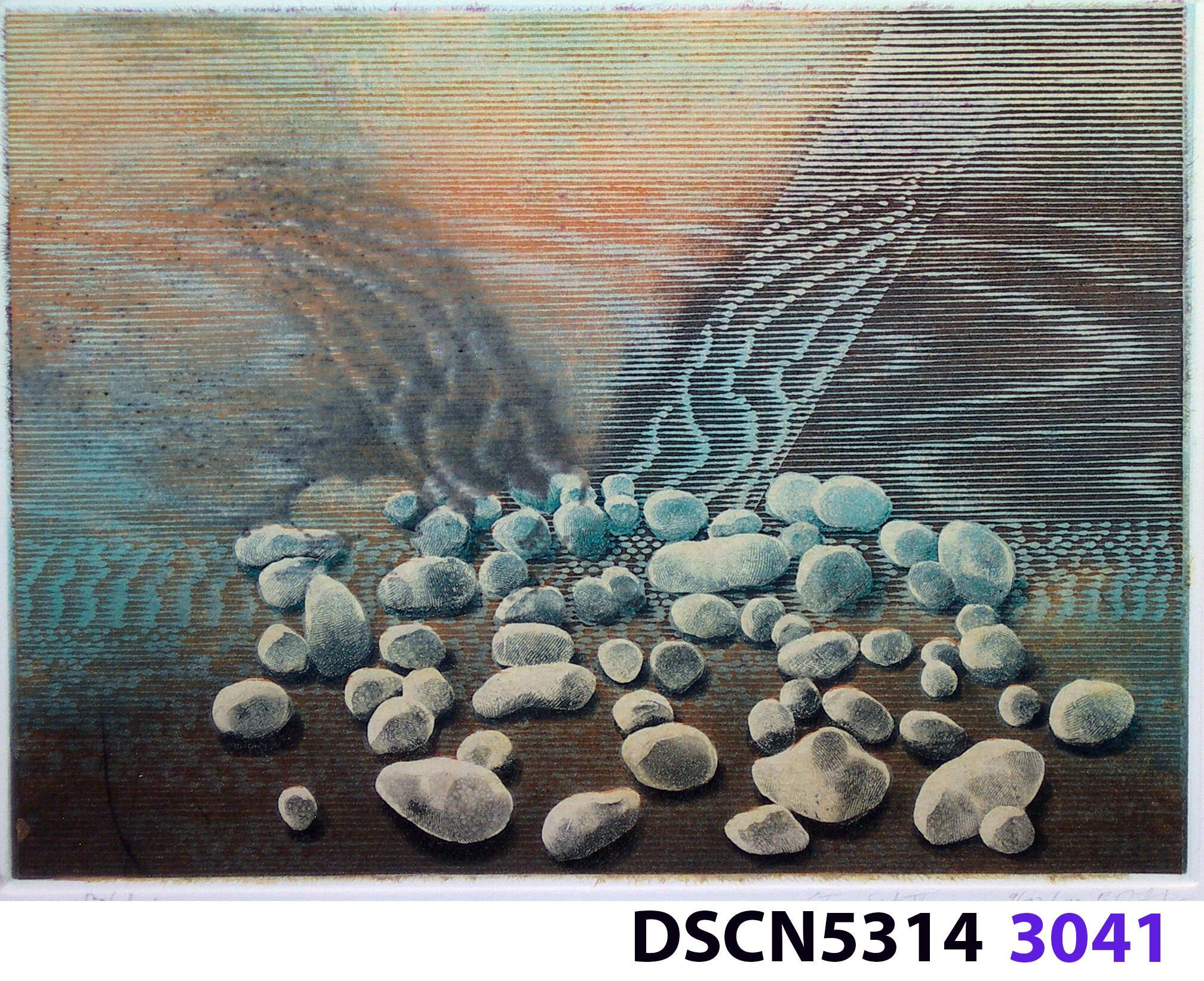 As a historical note, artist Bill Ritchie worked briefly at the Munch Museum studying the wood blocks that Edvard Munch cut and printed. Some of his woodcuts, notably "Badende Mann," (Bathing Man) he printed not as replicas or multiples all alike, but with different colors. These are termed monoprints, which means there are blocks which and be used to make almost identical impressions, but for artistic purposes (i.e., enjoyment of the creative artist) but the artist chose instead to make variations. In this print, Stone Set, Bill used an etched zinc plate from the Stone Set series and an under-image to a carved woodblock. Most, if not all, of the etched plates were printed in black, but the woodblock, being that it is printed with water-based colors in the Japanese manner (sosaku hanga) invites spontaneous color changes. The printer only has to dip the brush into a different color on the palette to produce a change. In other, mostly oil-based printing mediums, color changes are not that easy. Munch, for example, had to clean his inking slab and roller each time he wanted to try a different color. It must be mentioned, also, that Bill carved the lines in wood based on his video art. Television in those days was analog technology, with one or three electron beams scanning side-to-side of the picture from top to bottom and back again. The "picture" in Bill's video for this woodcut was not of the the real world, but the lines were instead the result of his stopping a videotape on a reel-to-reel videotape player and freezing the scanning at that stop-point. He photographed the TV screen, printed the negatiive, an traced it line-by line onto the woodcut and started carving. Another element to be mentioned is that the woodcut was printed on thin Asian paper (which works best in Japanese woodcut-style printing), let dry, then laminated to the etching in a second printing. The method is called Chine-colle, with water-based paste used to glue the sheets togehter. On close examination, one can tell the black oil-based etching ink is printed over the color, water-based ink.
