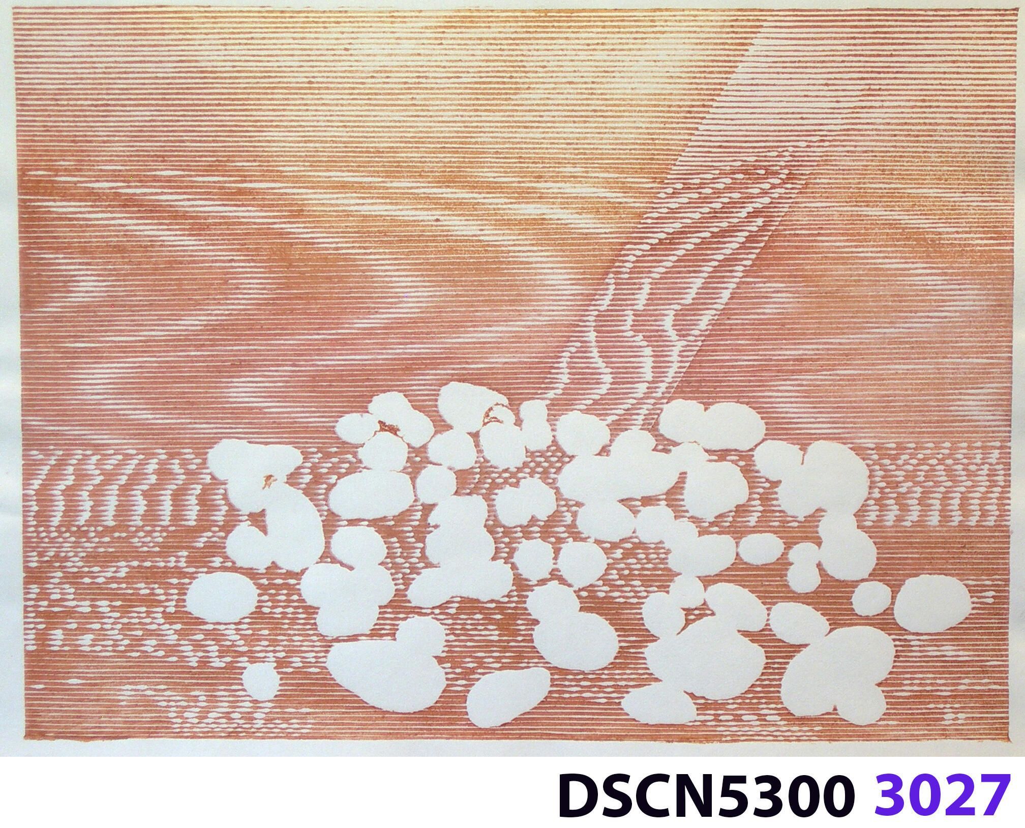 As a historical note, artist Bill Ritchie worked briefly at the Munch Museum studying the wood blocks that Edvard Munch cut and printed. Some of his woodcuts, notably "Badende Mann," (Bathing Man) he printed not as replicas or multiples all alike, but with different colors. These are termed monoprints, which means there are blocks which and be used to make almost identical impressions, but for artistic purposes (i.e., enjoyment of the creative artist) but the artist chose instead to make variations. In this print, Stone Set, Bill used an etched zinc plate from the Stone Set series and an under-image to a carved woodblock. Most, if not all, of the etched plates were printed in black, but the woodblock, being that it is printed with water-based colors in the Japanese manner (sosaku hanga) invites spontaneous color changes. The printer only has to dip the brush into a different color on the palette to produce a change. In other, mostly oil-based printing mediums, color changes are not that easy. Munch, for example, had to clean his inking slab and roller each time he wanted to try a different color. It must be mentioned, also, that Bill carved the lines in wood based on his video art. Television in those days was analog technology, with one or three electron beams scanning side-to-side of the picture from top to bottom and back again. The "picture" in Bill's video for this woodcut was not of the the real world, but the lines were instead the result of his stopping a videotape on a reel-to-reel videotape player and freezing the scanning at that stop-point. He photographed the TV screen, printed the negatiive, an traced it line-by line onto the woodcut and started carving. Another element to be mentioned is that the woodcut was printed on thin Asian paper (which works best in Japanese woodcut-style printing), let dry, then laminated to the etching in a second printing. The method is called Chine-colle, with water-based paste used to glue the sheets togehter. On close examination, one can tell the black oil-based etching ink is printed over the color, water-based ink.