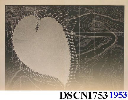Artist's iconic images of heart-like forms called Loci (plural of Locus), the famous Hokusai print known as the "Great Wave" stylized, a map background derived from an area known as the "Crossing of the Fathers," on the Colorado River, now under Lake Powell, Arizona, filming site of the spaceship crash scene in Planet of the Apes. One of 141 impressions.Artwork Details