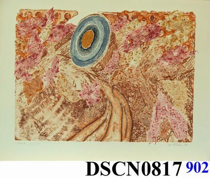 Intaglio and relief. Orange, gray, blue and yellow. Image on buff Van Gelder Zonen paper. Printed from etched and soldered zinc plate, various metal collage. Signed lower right.Artwork Details