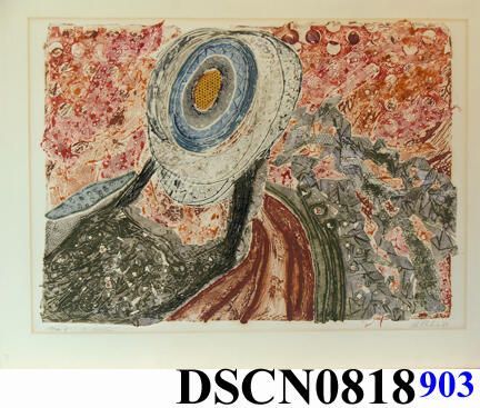 Intaglio and relief. Orange, green, gray, blue and yellow. Image on buff Van Gelder Zonen paper. Printed from etched and soldered zinc plate, various metal collage. Signed lower right.Artwork Details