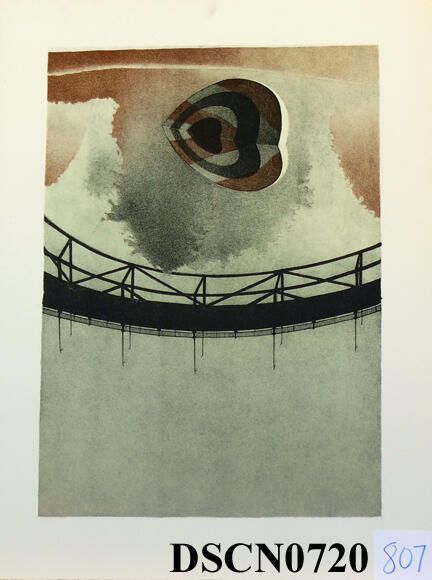 Target Heart 2: Trial proof in the Target Heart 2 edition. The crayon manner drawing on stone is slow and exacting in the way that I approached the method, and a good way to meditate on my themes. I was combining the target heart, trees, reflections, and bridge themes into the composition. This was when trees were moving back to the background, the bridge an over-arching character and the target hearts to the foreground.