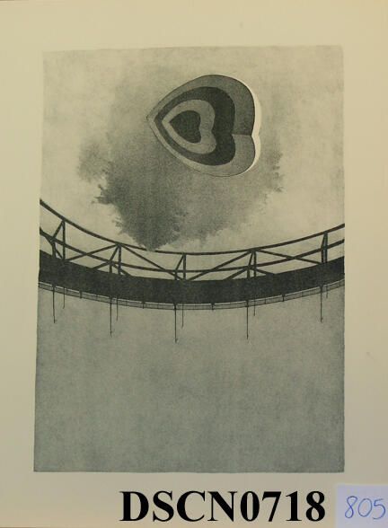 Trial proof in the Target Heart 2 edition. The crayon manner drawing on stone is slow and exacting in the way that I approached the method, and a good way to meditate on my themes. I was combining the target heart, trees, reflections, and bridge themes into the composition. This was when trees were moving back to the background, the bridge an over-arching character and the target hearts to the foreground.