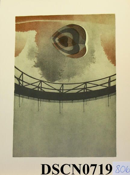 Target Heart 2: Trial proof in the Target Heart 2 edition. The crayon manner drawing on stone is slow and exacting in the way that I approached the method, and a good way to meditate on my themes. I was combining the target heart, trees, reflections, and bridge themes into the composition. This was when trees were moving back to the background, the bridge an over-arching character and the target hearts to the foreground.