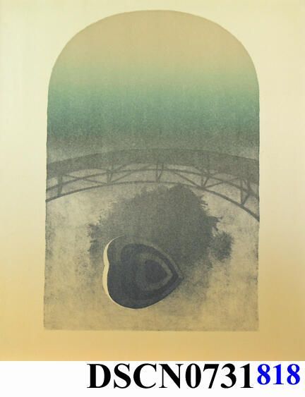 Target Heart 2: Trial proof in the Target Heart 2 edition. The crayon manner drawing on stone is slow and exacting in the way that I approached the method, and a good way to meditate on my themes. I was combining the target heart, trees, reflections, and bridge themes into the composition. This was when trees were moving back to the background, the bridge an over-arching character and the target hearts to the foreground.