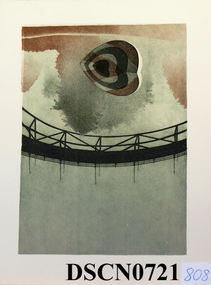 Trial proof in the Target Heart 2 edition. The crayon manner drawing on stone is slow and exacting in the way that I approached the method, and a good way to meditate on my themes. I was combining the target heart, trees, reflections, and bridge themes into the composition. This was when trees were moving back to the background, the bridge an over-arching character and the target hearts to the foreground.