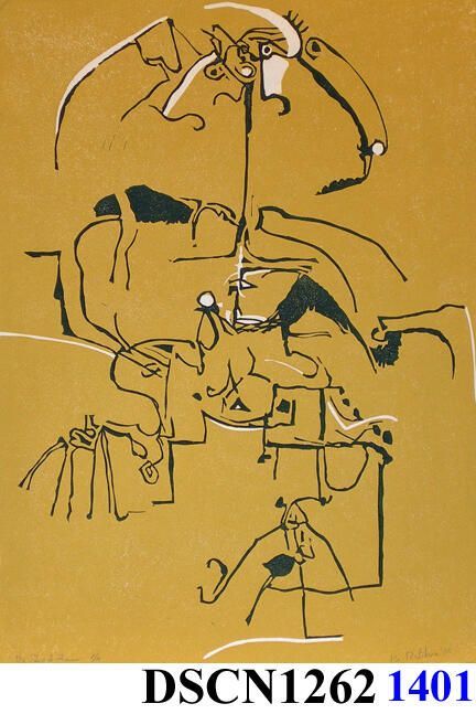 Relief. Ochre, black and white. Image 13 1/2" x 10" (bleeds to edges of paper). Signed lower right.Type of Print