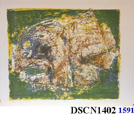Lithograph. Green, yellow, blue. Image 12" x 14" on 14" x 17 1/2" Buff Basingwerk Parchment paper. Signed lower right.Type of Print