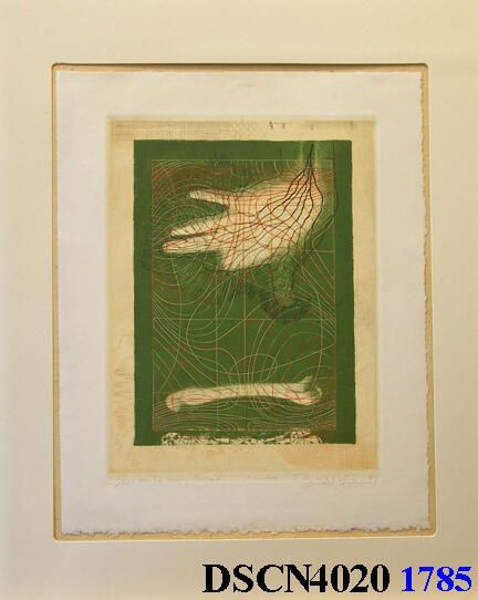 Intaglio. Green, black and vermillion. Image 12" x 9" on 15" x 12" white Copperplate Deluxe paper. Signed lower right.Inscription/Signature/Marks
