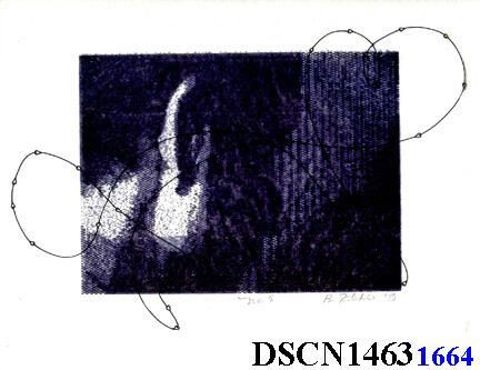 Computer graphic. Black and white. Image 11" x 14" on Hors Commerce newsprint paper; edition on Rives BFK Journal paper; Stonehinge tan paper; paper and Chronar (mylar overlay hand-drawn in ink with template). Signed lower right.Made/Created