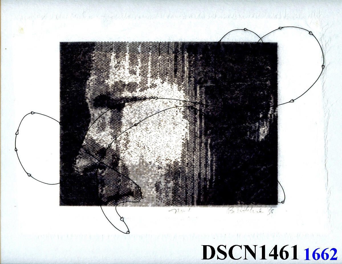 Computer graphic. Black and white. Image 11" x 14" on Hors Commerce newsprint paper; edition on Rives BFK Journal paper; Stonehinge tan paper; paper and Chronar (mylar overlay hand-drawn in ink with template). Signed lower right.Made/Created
