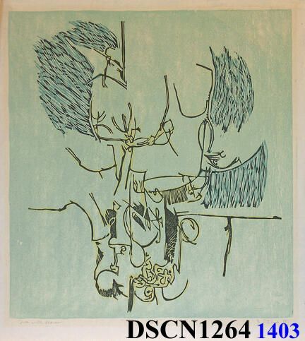 Relief. Green, blue, black and ochre. Image 14 1/2" x 13 1/2" on 16 1/2" x 15" white Japanese paper. Signed lower right.Type of Print