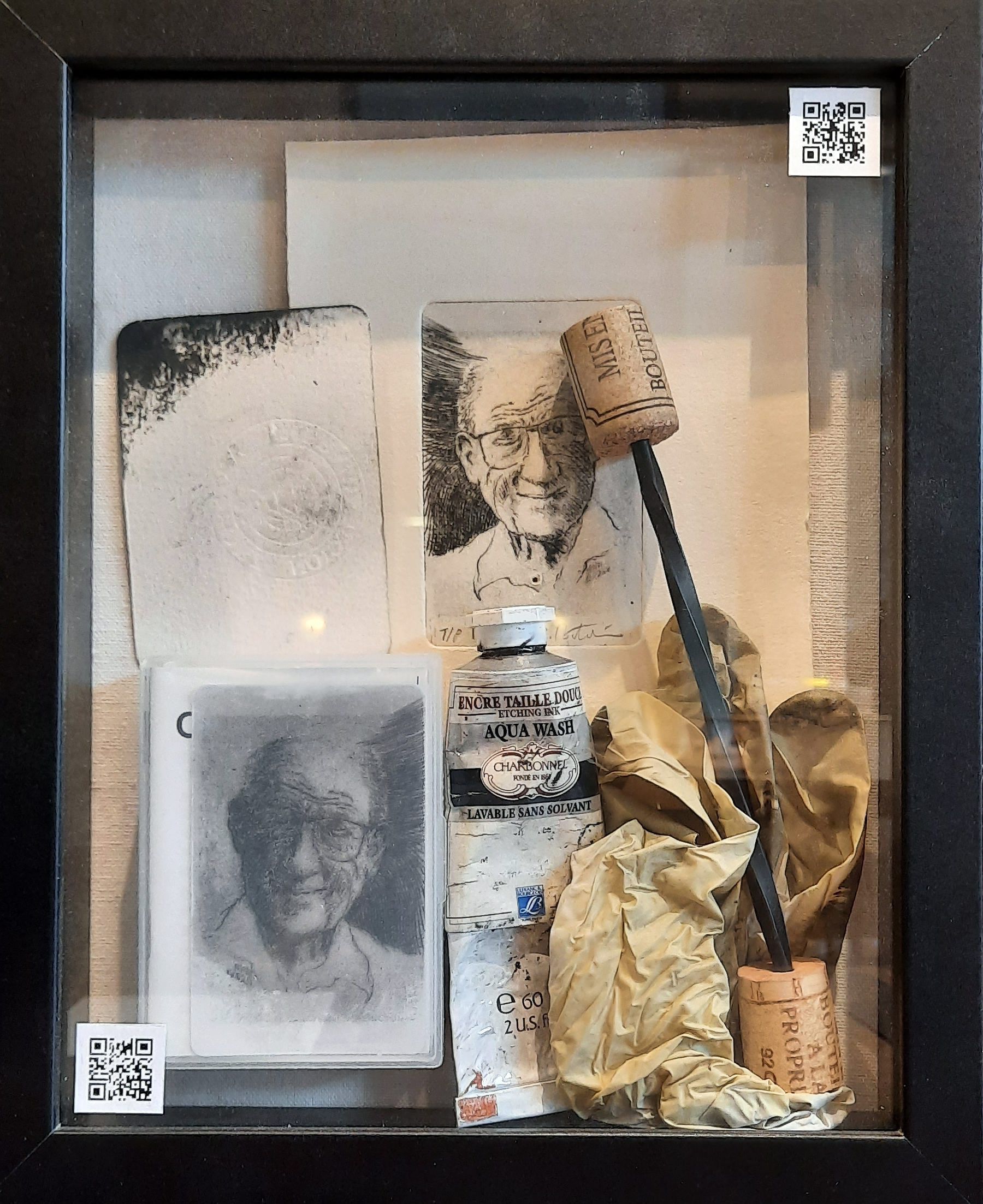 Shadow box frame with a print of Bill Ritchie's face, it's plate, a rectangle paper with an embossed seal, a tube of etching ink, a scribe with corks on each end, and latex gloves.Made/Created
