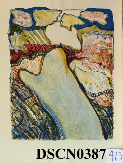Lithograph. Red, blue, green, yellow and black. Image 19" x 15" on 22 1/2" x 17 1/2" Rives BFK paper. Signed lower right.Type of Print
