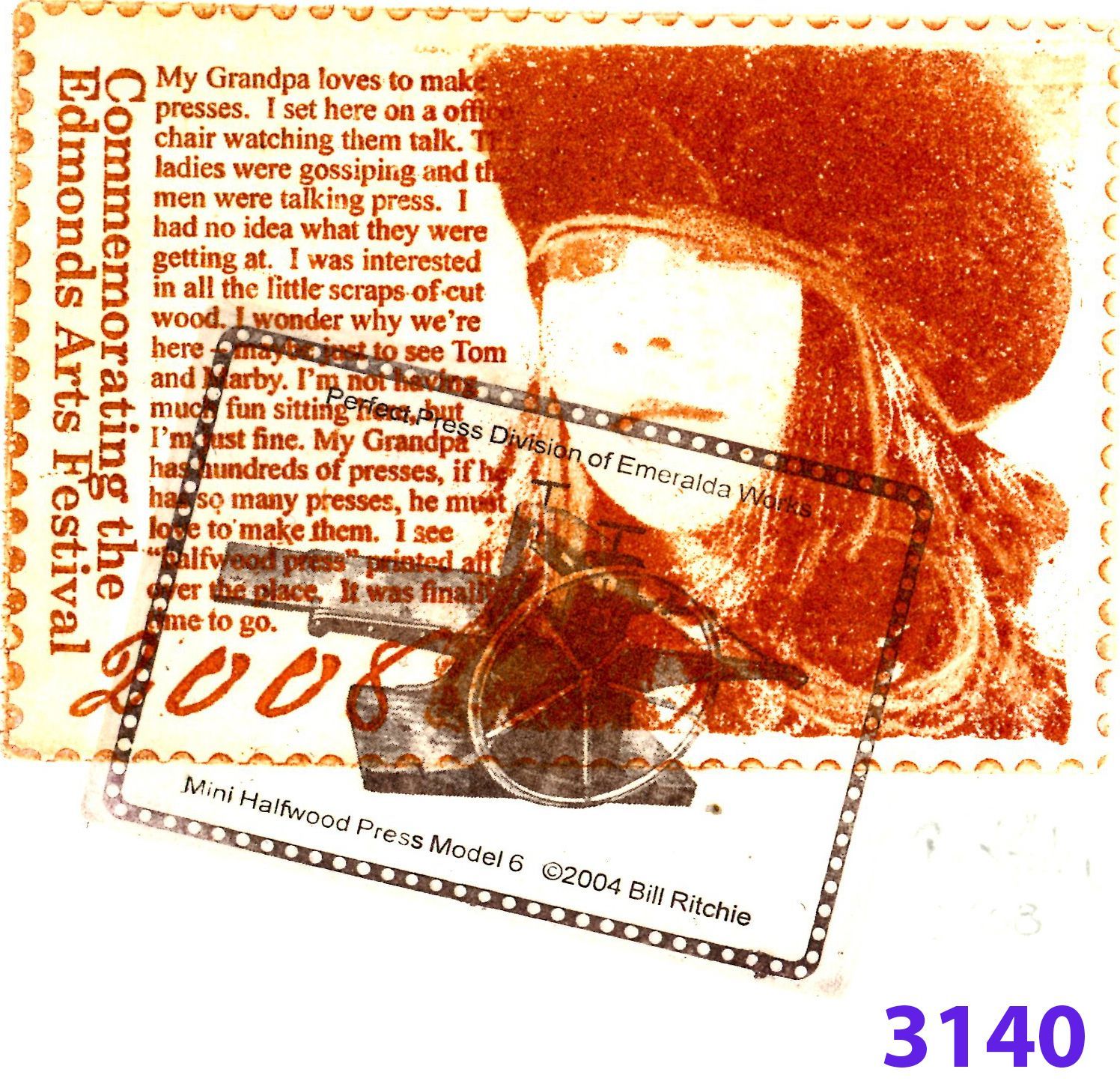 Intaglio. Sanguine, burnt yellow on natural Arches Cover paper with black Mini Halfwood stamp. Signed Bill Ritchie 2008 Lower Right.Type of Print
