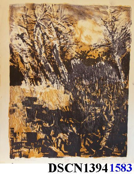 Lithograph. Ochre and black (deep purple). Image 16" x 12" on 17 3/4" x 13 5/8" Basingwerk Parchment paper. Signed lower right. Unframed.Type of Print