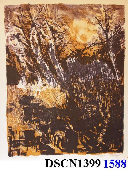 Lithograph. Ochre and black (deep purple). Image 16" x 12" on 17 3/4" x 13 5/8" Basingwerk Parchment paper. Signed lower right. Unframed.Type of Print