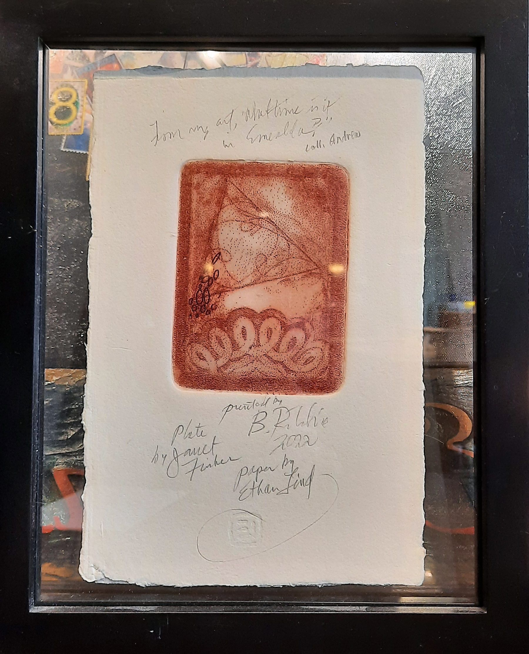 Above print "From my art, "What Time is it in Emeralda?, coll. Andrew", lower left "plate by Janet Fisher" and lower right "printed by B. Ritchie 2022" and lower center "paper by Ethan Lind"Other Names and Numbers