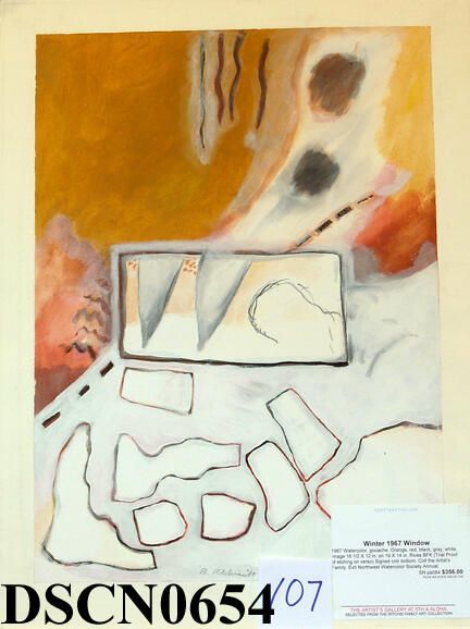 Watercolor, gouache. Orange, red, black, gray and white. Image 16 1/2" x 12" on 19" X 14" Rives BFK paper (Trial Proof of etching on verso). Signed center bottom.Artwork Details